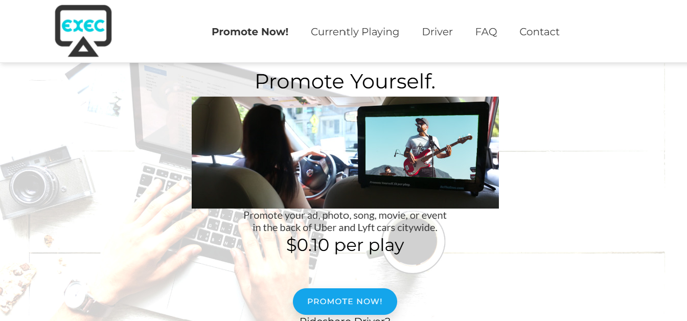 exec is a rideshare advertising platform allowing anyone to promote anything for $0.10 per play.